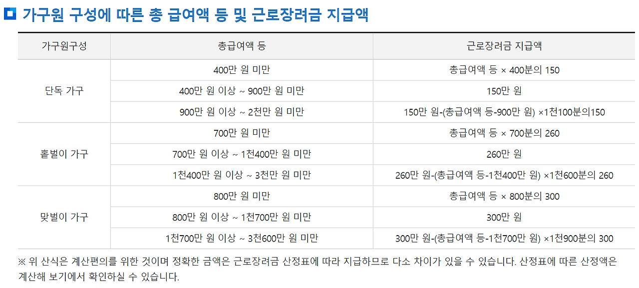 단독가구, 홑벌이가구 그리고 맞벌이가구의 총급여액에 따라 지급액이 상이합니다.